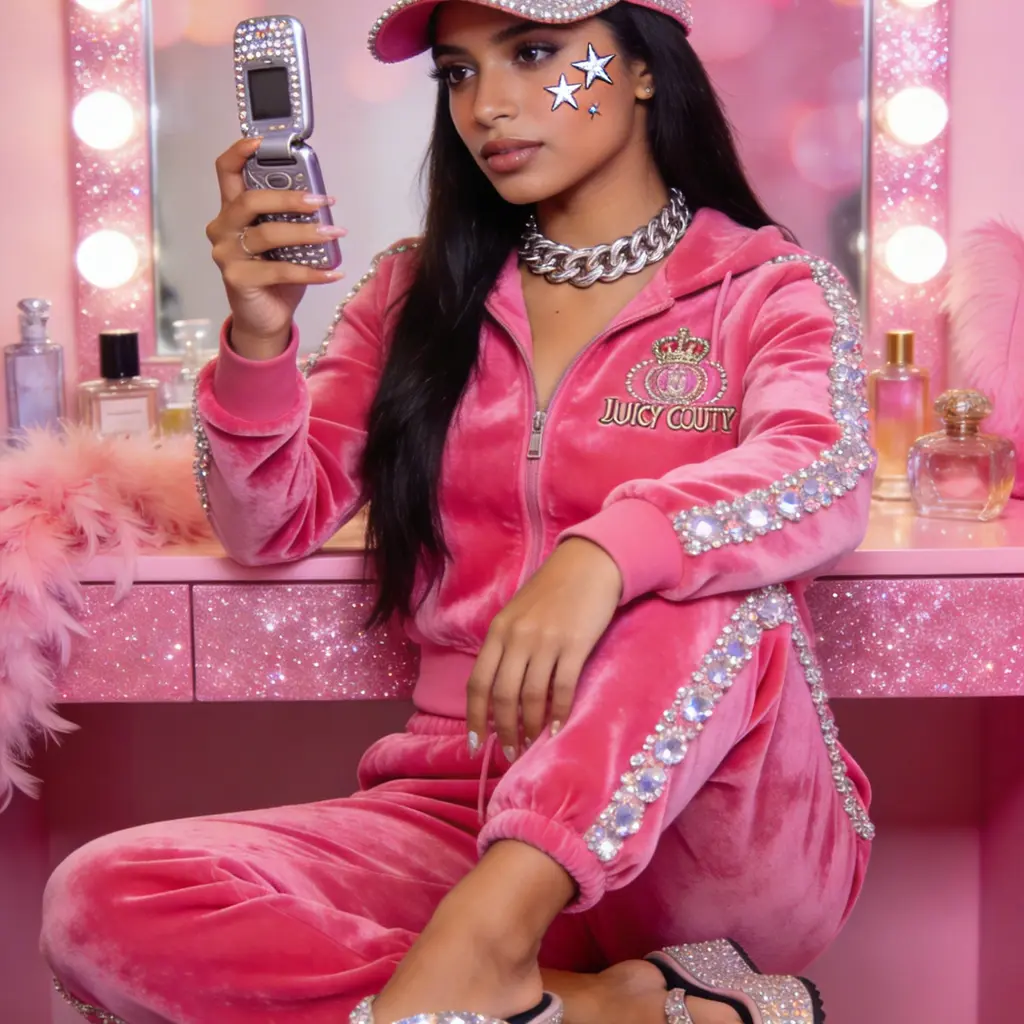 Channel Juicy Couture era fashion with the McBling preset — rhinestones, pink velour, chunky silver jewelry, and early 2000s glossy glamour. Perfect for throwback content.